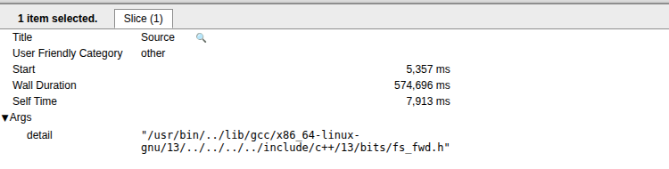 By clicking on each element in the flame graph, you can get more detailed information. For example, clicking on the “Source” element will show which header file was processed and how much time the compiler spent on it.